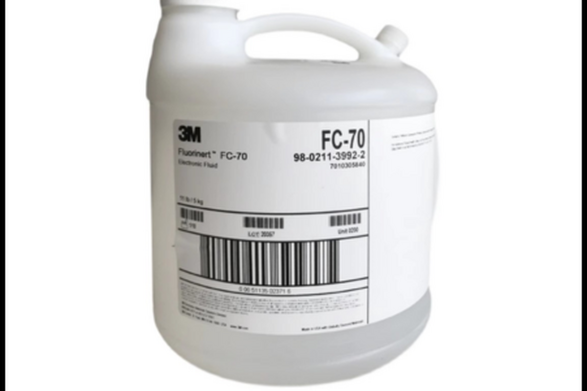 3M™ Fluorinert™ Electronic Liquid FC-70 is a clear, colorless, fully-fluorinated liquid. Like other Fluorinert electronic liquids, Fluorinert liquid FC-70 is thermally and chemically stable, compatible with sensitive materials, nonflammable, demonstrates low toxicity and leaves essentially no residue upon evaporation. This unique combination of properties makes Fluorinert liquid FC-70 ideal for many electronics applications, including vapor phase soldering and thermal management.