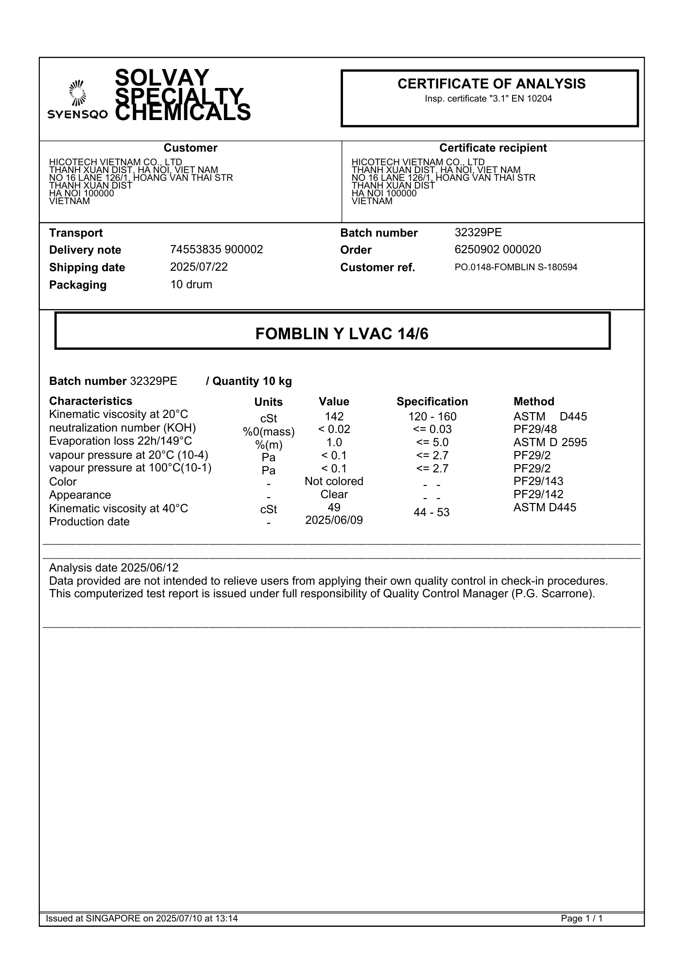 Certificate of Analysis (COA) for Fomblin Y LVAC 14/6